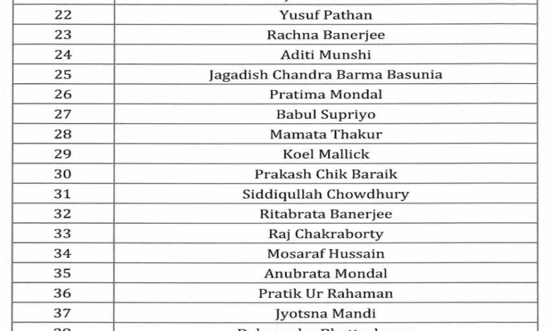 पहले चरण के लिए जारी सूची में सिर्फ शीर्ष नेतृत्व ही नहीं, बल्कि संगठन के अनुभवी और भरोसेमंद चेहरों को भी जगह दी गई है. वरिष्ठ मंत्री फिरहाद हकीम, पार्टी के अनुभवी नेता सुब्रत बख्शी, चंद्रिमा भट्टाचार्य और कल्याण बनर्जी जैसे नाम इस सूची में शामिल हैं.