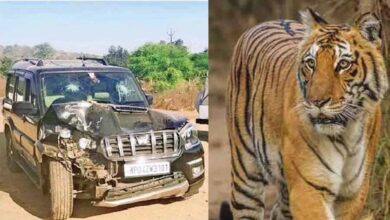 दो बाघों को देख डरा एसयूवी ड्राइवर, पेड़ से टकराई गई गाड़ी