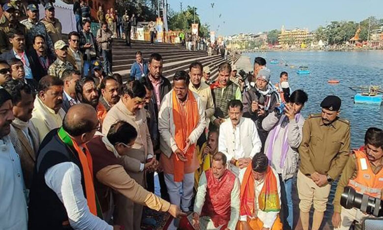 मुख्यमंत्री डॉ. मोहन यादव ने सोमवार को क्षिप्रा मैया का पूजन कर दुग्धाभिषेक किया और चुनरी भी भेंट की। उन्होंने मंत्रोच्चारण और शंखध्वनि के बीच घाट पर पूजन किया। मुख्यमंत्री डॉ. यादव ने दत्त अखाड़ा क्षेत्र स्थित आश्रम पहुंचकर महंत गुरु सुंदर जी महाराज जी के चरणों में नमन किया और उनका आशीर्वाद प्राप्त किया। गुरु संत सुंदर महाराज जी द्वारा उज्जैन को पवित्र नगरी घोषित करने की मांग भी मुख्यमंत्री के समक्ष रखी। इस अवसर पर प्रभारी मंत्री गौतम टेटवाल, जल संसाधन मंत्री तुलसीराम सिलावट, सांसद अनिल फिरोजिया, विधायक अनिल जैन कालूहेडा, संजय अग्रवाल, बहादुर सिंह बोरमुण्डला और अन्य जन प्रतिनिधि उपस्थित रहे।