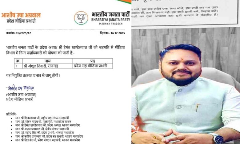 मध्य प्रदेश बीजेपी ने एक बड़ी नियुक्ति कर दी है। प्रदेश बीजेपी अध्यक्ष हेमंत खंडेलवाल की सहमति के बाद अंशुल तिवारी को भाजपा प्रदेश सह मीडिया प्रभारी का दायित्व सौंपा गया है।