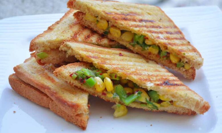 गरमा-गरम कॉर्न सैंडविच को तिकोने टुकड़ों में काटें और हरी चटनी, टोमैटो केचप या चीज डिप के साथ परोसें।