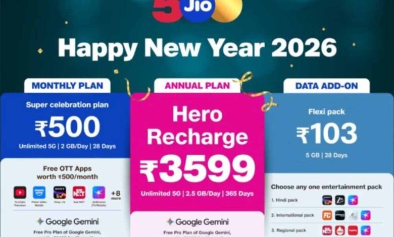जियो ने यूजर्स को न्यू ईयर गिफ्ट दे दिया है। कंपनी ने यूजर्स को लिए Happy New Year 2026 प्लान्स को लॉन्च किया है। फोनअरीना की रिपोर्ट के अनुसार ये प्लान 103 रुपये (फ्लेक्सी पैक डेटा ऐड-ऑन), 500 रुपये (सुपर सेलिब्रेशन मंथली प्लान) और 3599 रुपये ( हीरो रिचार्ज ऐनुअल प्लान) हैं। कंपनी के ऐनुअल और मंथली प्लान 365 दिन तक की वैलिडिटी के साथ आते हैं। इनमें आपको हर दिन 2.5जीबी तक डेटा मिलेगा। ये प्लान एलिजिबल यूजर्स को अनलिमिटेड 5G डेटा भी देते हैं। इन प्लान में आपको 35100 रुपये की कीमत वाला गूगल जेमिनी प्रो प्लान का ऐक्सेस भी मिलेगा, जिसकी वैलिडिटी 18 महीने है। वहीं, कंपनी का डेटा पैक यूजर्स को 5जीबी टोटल डेटा के साथ कई सारे ओटीटी ऐप का ऐक्सेस देता है। आइए डीटेल में जानते हैं इन प्लान के बारे में।