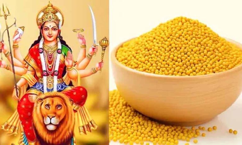 नवरात्रि में पूजा के दौरान एक चांदी की कटोरी एक मुट्ठी पीली सरसों रखकर माता के चरणों में रखें. फिर पूजा करें. इसे पूजा पूर्ण होती है.