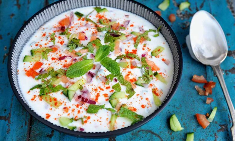 अब इस फेंटे हुए दही में कद्दूकस किया हुआ खीरा और गाजर मिलाएं। साथ ही, बारीक कटा हुआ प्याज और टमाटर भी डाल दें।
