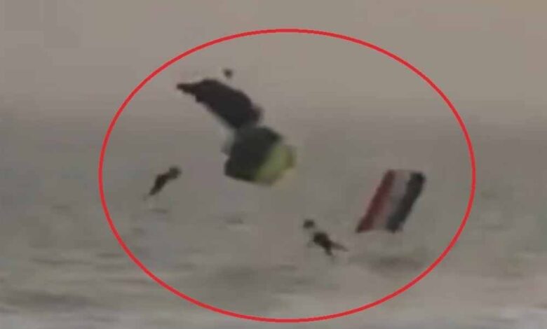 भारतीय नौसेना के दो अधिकारी ऑपरेशनल डेमोंस्ट्रेशन के रिहर्सल के दौरान एक हादसे का शिकार हो गए। उनके पैराशूट उतरने के दौरान आपस में उलझ गए, जिससे वे विशाखापट्टनम के रामकृष्ण बीच के पानी में आ गिरे। गनीमत रही कि दोनों अधिकारी सुरक्षित बच गए। हादसा उस वक्त हुआ जब पूर्वी नौसेना कमान के ऑपरेशनल डेमोंस्ट्रेशन की तैयारी चल रही थी। वीडियो में देखा गया कि दोनों अधिकारी पैराशूट लिए आसमान में उड़ रहे थे। उनमें से एक के पास राष्ट्रीय ध्वज था। लेकिन उतरने के दौरान उनके पैराशूट आपस में ही उलझ गए और वे समुद्र में गिर गए।